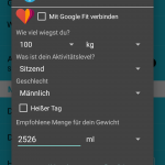 Wie viel Flüssigkeit du am Tag zu dir nehmen solltest, errechnet dir die App anhand deiner eigen gemachten Angaben. Alternativ kannst du die App auch mit Google Fit verbinden und deine Daten daher beziehen. Danach kannst du Erinnerungen einstellen, das du auch immer an das Trinken erinnert wirst.