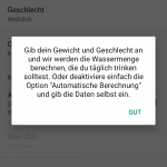Mit Water Time Gold: Wasser Zeit könnt ihr euren täglichen Flüssigkeitsbedarf anhand eurer Größe und eures Gewichtes errechnen lassen. Ist dies einmal geschehen, könnt ihr mit einigen wenigen Klicks ebenfalls die Benachrichtigungen einstellen, die ihr euch in verschiedenen Zeitintervallen einstellen könnt. zur Auswahl stehen euch, alle 15, 30, 45, 60 und 120 Minuten. Die Benachrichtigungen laufen super und ihr könnt auch direkt in der Benachrichtigungsleiste vorgegebene ml antippen.