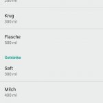 Ebenso hat man in der App voreingestellte Flüssigkeiten. So ist eine korrekte Abrechnung von zu sich genommenen Wasser möglich. Zu Auswahl stehen hier Milch, Tee, Kaffee, Saft und natürlich Wasser. Diese gibts wieder in verschiedenen Mengen.