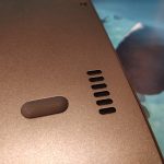 Hinten am Gerät befindet sich nichts und vorne hat man eine circa 6cm lange und 3mm breite Einbuchtung um das Display anzuheben. Unten am Xiaomi Mi Air finden wir 5 Gumminoppen für einen rutschfesten Stand. Ebenso finden sich dort ein paar Aufkleber die unter anderem auf AKG Sound, Dolby Audio Premium, Nvidia und HDMI hinweisen. Mittig auf der oberen Sektion der Unterseite finden wir auf einer Länge von circa 21,3cm und einer Breite von einem Zentimeter 58 Lüftungsschlitze.
