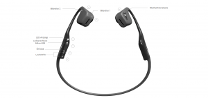 Das Design des Headsets hat mich von Anfang an angesprochen. Der Rahmen, welcher rundum aus Titan besteht, wurde mit einer Art Gummi überzogen woran vorn die Ohrhörer befestigt sind. Das ganze Konstrukt ist Schweiß- und Wasserabweisend und IP55 Zertifiziert. An manchen Stellen kann man ganz leicht ein unsauberer Verarbeitung sehen, was dann aber Meckern auf ganz hohem Niveau wäre. Kurz vor den „Bügeln“ sitzen nochmal zwei größere Erhebungen. Während auf der linken Seite auf der Erhebung nur das Aftershokz Logo die Außenseite und ein paar Informationen die Innenseite zieren, wurden an der Erhebung der rechten Seite Bedienelemente und der Micro USB Eingang verbaut.