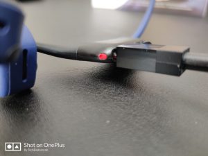 Als Bedienelemente hat man zwei Lautstärketasten, wobei die Plus Taste auch als Powerknopf genutzt wird. Vor den Tasten liegt der Micro USB Eingang, mit dem das Headset wieder mit neuem Strom versorgt werden kann. Der Micro USB Eingang wird von einer Gummiabdeckung geschützt. Und auch NUR wenn diese richtig geschlossen ist, wird die IP55 Zertifizierung gewährleistet. Vor dieser Öffnung, am Übergang zum Bügel sitzt eine kleine Indikator LED. Diese kann in Blau und rot leuchten. Rot leuchtet sie wenn sie geladen wird, blau wenn der Akku fertig aufgeladen ist. Wenn die LED abwechselnd rot und blau blinkt, ist das Headset gerade im Pairing Modus.